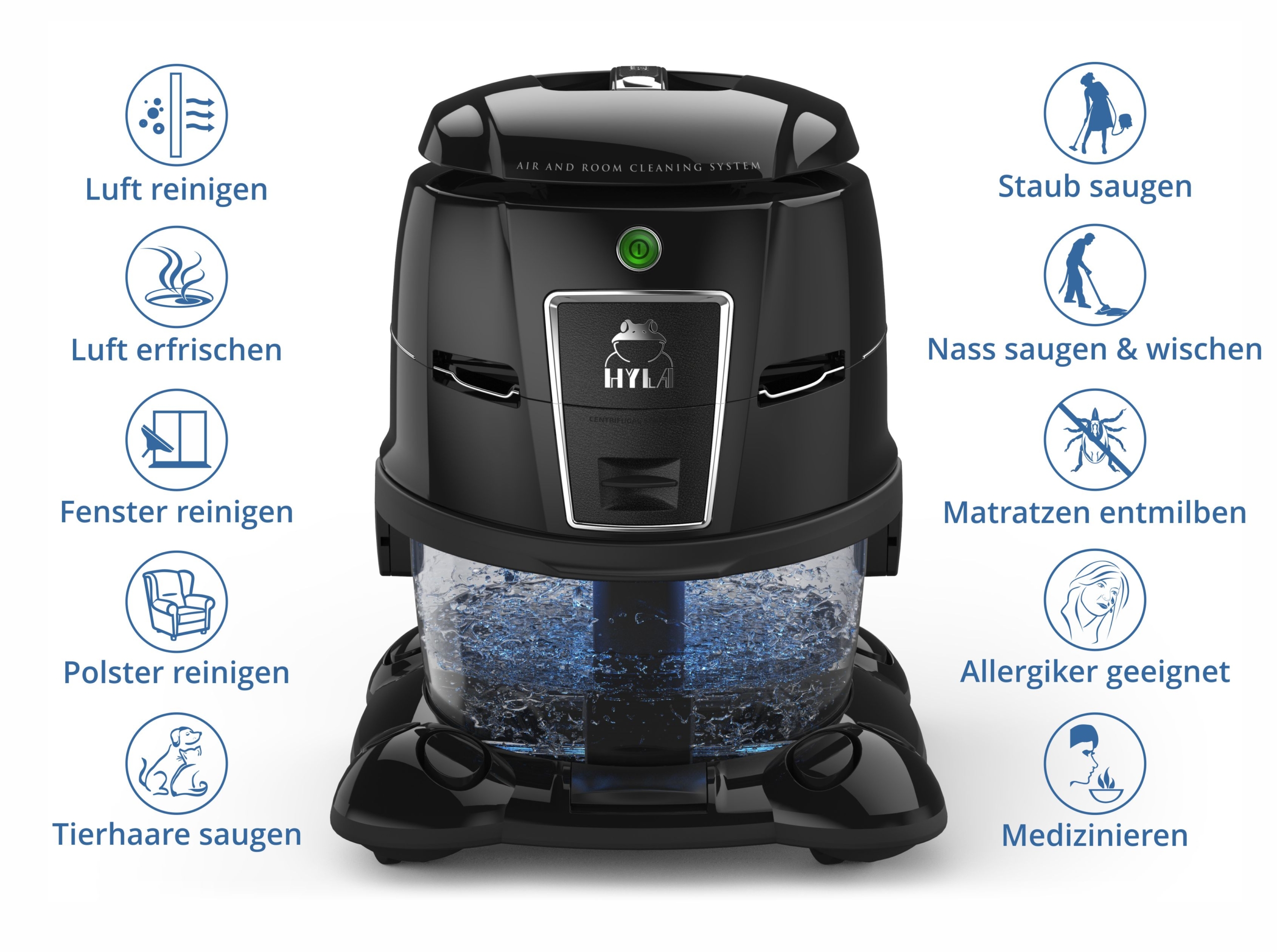 Der Hyla nutzt die natürliche Reinigungskraft des Wassers und filtert damit viel effizienter als herkömmliche Staubsauger.
